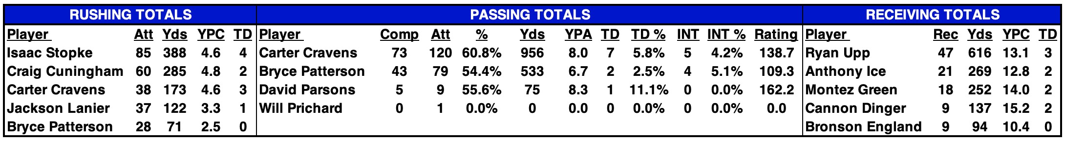 | Southern Virginia | 61-10 | Southern Virginia | 49-6 | at | St Francis (PA) | 21-14 | at | Western Illinois | 6-31 | ||