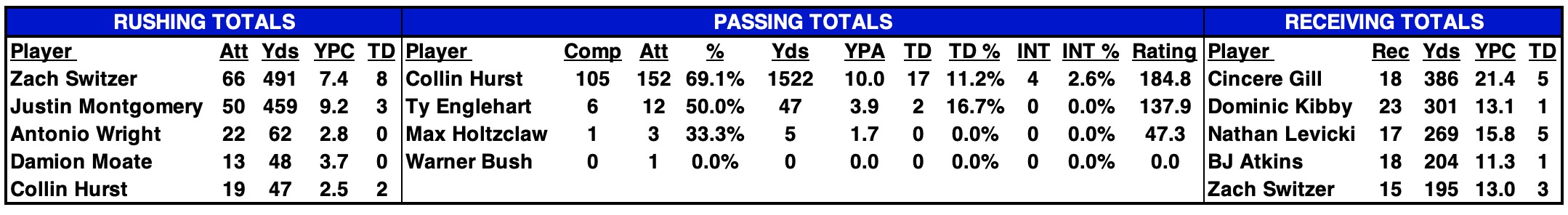 | VMI | 20-31 | NC Central | 28-24 | at | VMI | 45-21 | at | Tusculum | 30-21 | ||